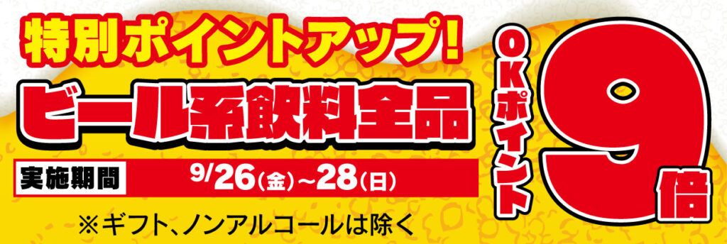 さらに、ビール系飲料は全品 OKポイントが なんと 9倍‼ 9倍ですよ~